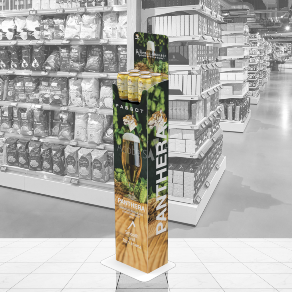 The front panel, side panels, and header sign can be replaced to match different promotions. This allows the display to be reused long-term while maintaining a consistent presence in-store. * The image on the left shows the 12-can and 24-can versions. * The 4-can and 6-can versions use removable adhesive labels.